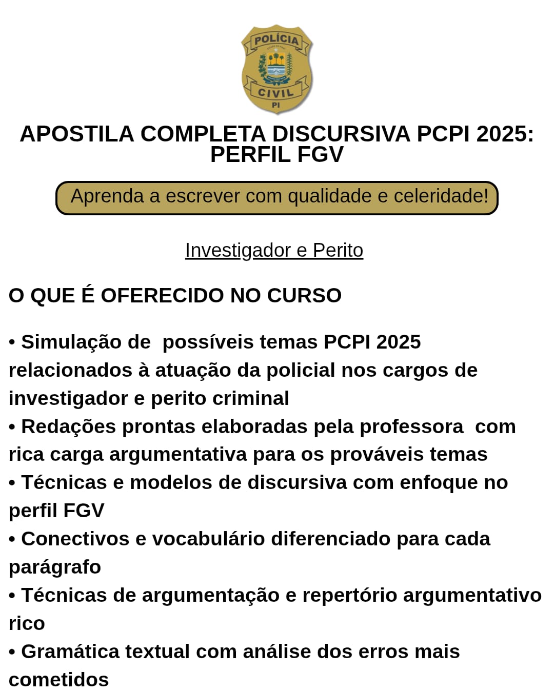 APOSTILA COMPLETA (PDF) DISCURSIVA PCPI 2025: PERFIL FGV