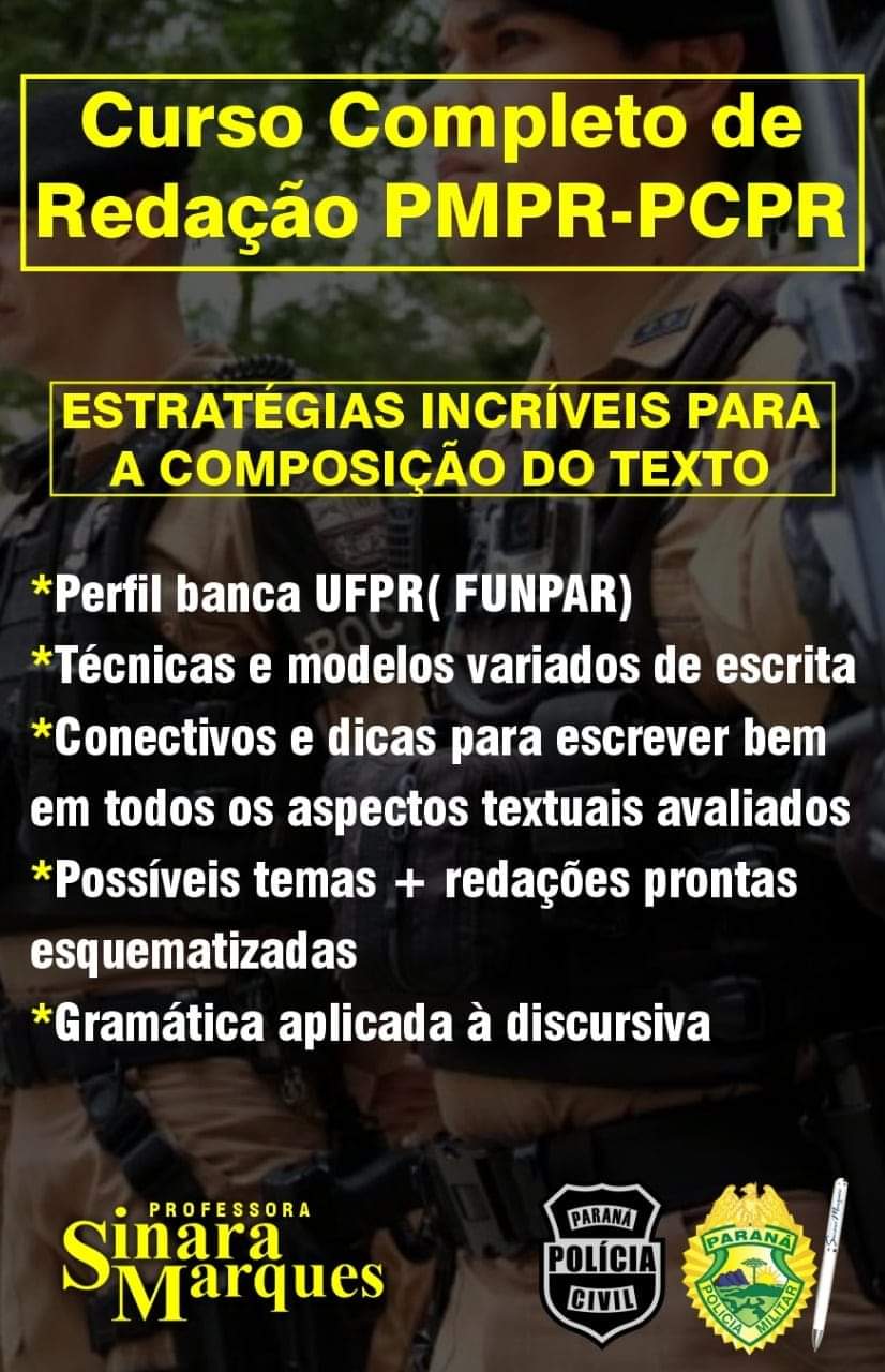 - O curso é focado na PMPR e na PCPR, pois o perfil da redação dos dois certames é o mesmo: texto dissertativo-argumentativo sobre temas atuais, mínimo de 20 e máximo de 25 linhas.